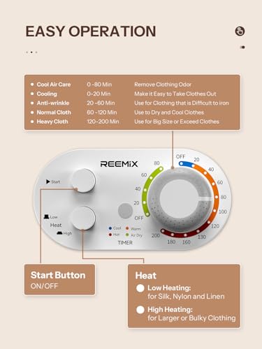 【Multifunction Vented Dryer】According to the material and weight of the cloth, you can set the time length or different mode for drying: Cool(0-20mins): cool down the temperature; Warm(20-60Mins): To dry and cool also leave the clothes wrinkle-free; Drying time (60-120Mins)Dry and cool clothes; Hot (120-200mins): for drying large quantities or bulky item, Air dry(0-80mins) run with cool air to remove clothing odor.