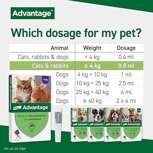 Specification: Advantage Spot On Flea Treatment For Large Cats and Rabbits Over 4kg (1 pipette, 80mg), Kills Fleas Within 24 Hours, Prevents Further Infestation For Up To Four Weeks in Cats