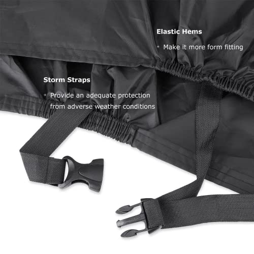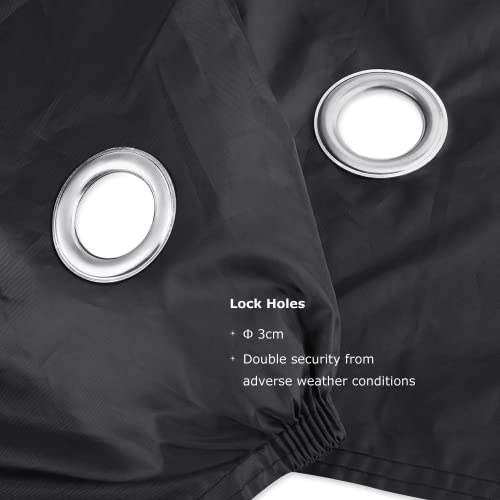STAY ON DURING HIGH WINDS – Elasticated front – middle – back hems and buckle on the middle to keep the cover in place during high winds. Two lock-holes at the front wheel area that can be used with your bikes for a double security from bike theft while providing an adequate protection from adverse weather conditions.