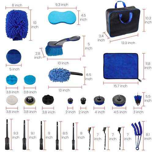 ①29PCS car detailing kit: Detailing Brushes*5,Drill Brush Set*5,Wire Brushes*3,Drill Polishing Sponge Pad*3,Car Washing Towel*2 ,Air Conditioner Outlet Brush*2,Wax Applicator*2,Imitation Wool Pad*1,Car Wash Mitt*1,Car Wash Sponge*1,Suction Cup*1,Durable Storage Bag*1,Dust Brush*1,Tire Brush*1. The car detailing kit is complete with tools that can basically meet all your car washing needs.