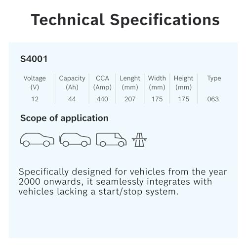 Specification: Bosch S4 001 Car Battery 44 A/h – 440 A – 12 V Battery, Type 063, Lead-acid for Non-Start/Stop Vehicles, Left (-) Right (+), 207 x 175 x 175 mm