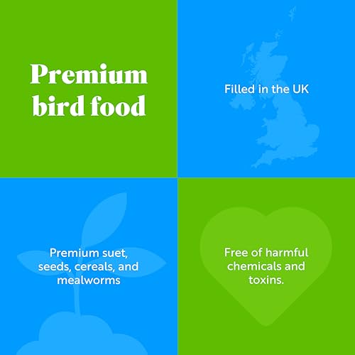 FILLED IN THE UK: Wild bird feed with a nutritious blend of premium UK suet, bird food mealworms, seeds, and cereals. Carefully crafted bird food coconut halves to ensure birds get the vital nutrients they need.