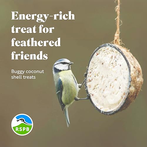 Specification: Coconut Bird Feeder Halves, Wild Bird Food for Small Birds with Suet, Dried Mealworms, Seeds, and Cereals, High Energy Food, Filled in the UK, Suitable for Year-Round Feeding – RSPB