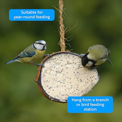 SUET BIRD FOOD: Suitable for year-round feeding, the coconut shell treats are a feeder and food in one, and are easy to hang from branches or bird feeding stations without the need for a feeder. Perfect for small birds and garden birds – an ideal choice for your backyard bird care.