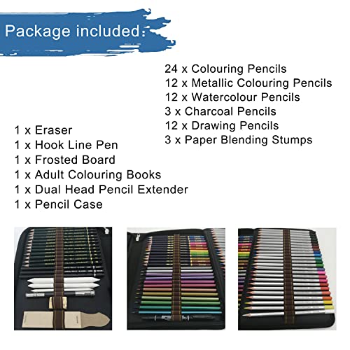 COMPLETE : Shuttle Art sketch pencil set comes with 24 x Colouring Pencils,12 x Metallic Colouring Pencils,12 x Watercolour Pencils,12 x Drawing Pencils,3 charcoal pencils,1 pencil extender, 1 sharpener,1 eraser ,3 blending paper stumps,72 packs in total.