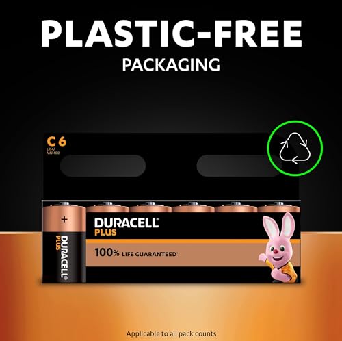 Specification: Duracell Plus C Batteries (6 Pack) – Alkaline 1.5V – 100% Life Guaranteed – Reliability For Everyday Devices – 0% Plastic Packaging – 10-Year Storage – MN1400