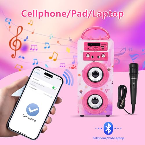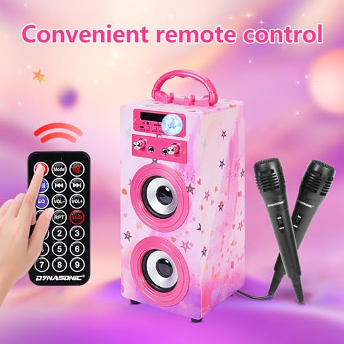 DYNASONIC Karaoke Machine with 2 Microphones, Portable Bluetooth Speaker with Lights, USB and SD Reader, Gift for Children Ages 5-13 (Model 15 lights)