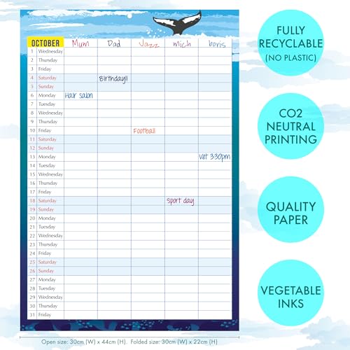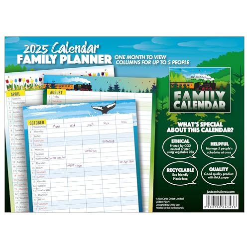 Specification: Family Calendar 2026, monthly planner with 5 columns. Useful as a family planner calendar 2026. Printed by CO2 neutral printer with vegetable ink, fully recyclable