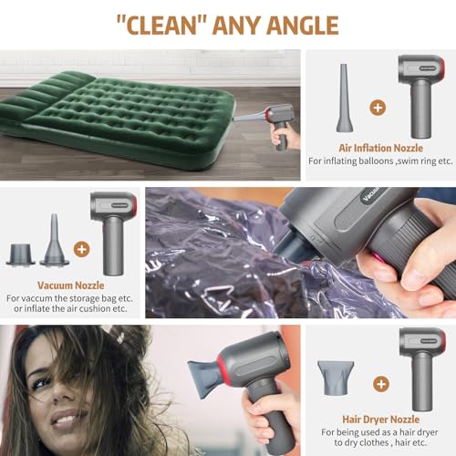 🎁【6 Convenient Nozzle Tools】- The car Cleaner with 6 different types of attachments for efficient suction and deep cleaning. Extended Suction Nozzle for cleaning uneven surfaces ; Brush Suction Nozzle for cleaning hair and dust on car or keyboard gaps ; Dust Blowing Nozzle for cleaning dust or fallen leaves on the surface of cars etc. ; Air Inflation Nozzle for inflating balloons ,swim ring ; Vacuum Nozzle for vaccum or inflate; Hair Dryer Nozzle used as a hair dryer to dry clothes, hair.