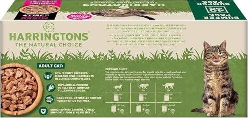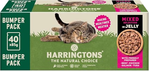 Specification: Harringtons Complete Wet Pouch Grain Free Hypoallergenic Adult Cat Food Mixed in Jelly Pack 40x85g – Beef, Chicken, Salmon & Tuna- Making Mealtimes Meatier