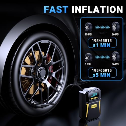 【Rapid inflation】: For tyres of size 195/65 R15, this car tyre inflator can raise the air pressure from 30 PSI to 36 PSI in 1 minute and from 0 PSI to 36 PSI in 5 minutes (note: it can work continuously for 15 minutes).