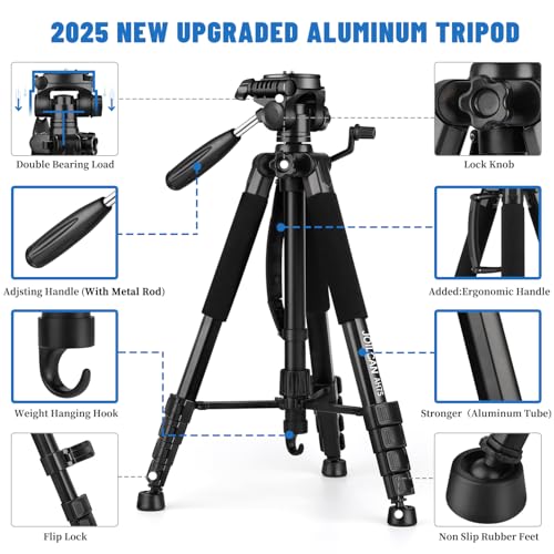 Specification: JOILCAN Camera Tripod for Canon Nikon, 74″ Lightweight DSLR Tripod Camera Stand with Detachable Head and Universal Phone Mount, Reinforced Aluminum Tall Tripod for Vlog Live Streaming Max Load 14LB