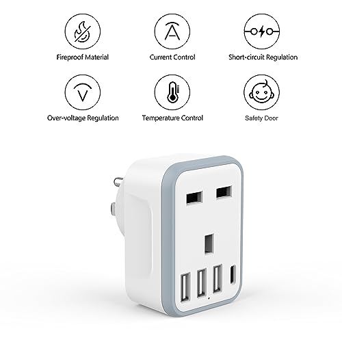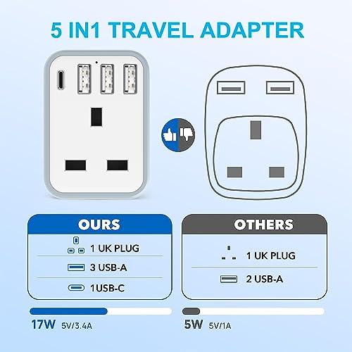 【5 in 1 UK to US Travel Adapter】 UK to US plug adapter has 3 USB A ports and 1 USB C port, a total output of 5V/3.4A and standard UK plug with maximum capacity of 2500W. Schuko Type B plug has grounded round pins and does not slip off easily when plugged into the wall.