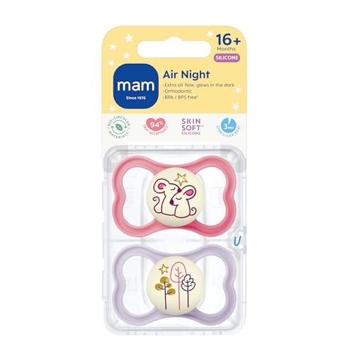 Specification: MAM Air Night Soothers | 16 Plus Months | 2 Pack | Glow in The Dark Dummies | Comes in Dummy Steriliser Case | Sustainable Materials | Baby Accessories | Pink (Various Designs)