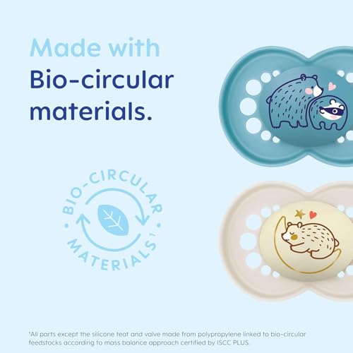 “MAM Original Day & Night Soother 4 Pack – Soothing day and night for babies 6–18 months With two day soothers and two that gently glow in the dark, the MAM Original Day & Night Soother 4 Pack is perfect for comfort round the clock, especially when the lights are out and baby needs soothing back to sleep. Each soother features MAM’s SkinSoft silicone teat, accepted by 94% of babies*, with a symmetrical shape designed to support healthy oral development. The lightweight curved shield sits gently on baby’s face with large air holes and soft inner dimples to reduce skin irritation. Co-developed with dentists and orthodontists, this soother set gives you peace of mind while helping your little one feel calm and content day or night. Product benefits: • Designed for babies aged 6–18 months • Includes 2x day soothers and 2x glow-in-the-dark night soothers • SkinSoft silicone teat feels like mum and is accepted by 94%* • Symmetrical shape supports natural jaw and teeth development • Curved shield with airflow holes to be gentle on skin • Helps settle baby day or night with ease • BPS/BPA free and baby-safe • From the UK’s no.1 soother and bottle brand** * Market research 2010–2023, tested with 1,588 babies ** The UK’s no.1 bottle & soother brand for the Baby Accessories & Baby Feeding category based on Sales Value for the 52-week period ending 25/01/2025 for the GB Total Retail Market. Copyright © 2025, Nielsen Consumer, LLC