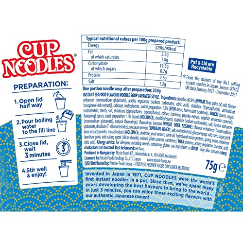 Instant wheat noodles with seasoning sauce, seafood flavour. For more than 60 years, Nissin have been warming bellies and putting smiles on faces with their range of satisfying noodles. GUARANTEED TO SATISFY YOUR SENSES!IngredientsNoodles 75.9% [WHEAT Flour, Palm Oil, Starch, Salt, Onion Powder, Flavour Enhancer (E621), Flour Treatment Agents (E500, E451), Antioxidant (E306), Acidity Regulator: Citric Acid, Colour: Beta-Carotene], Cabbage, Maltodextrin, Modified Starch, SQUID (MOLLUSC), Preparation [SQUID (MOLLUSC) 1.5% (in finished dry product), Starch, Salt, Flavour Enhancer (E621), Spice Oils], Spices, SURIMI Preparation [SURIMI (FISH) 1.0% (in finished dry product), WHEAT Starch, Sugar, Dextrose, Salt, Colours (E120, E160c, E150d), Flavouring], Flavourings (contain WHEAT, SOYA, SESAME), Soy Sauce Powder (SOYBEAN, WHEAT, Salt, Maltodextrin), Glucose Syrup, Flavour Enhancers (E621, E635), Pork Stock Powder, Dextrose, Corn, Sugar, Potassium Chloride, MUSSEL Extract (MOLLUSC), Yeast Extract, Palm Oil, Hydrolysed Maize Protein, Spring Onion, Thickener (E415), Salt, Anti-Caking Agent (E551), MILK Proteins, Acidity Regulators: Succinic Acid and Citric Acid, Colour: Plain Caramel
