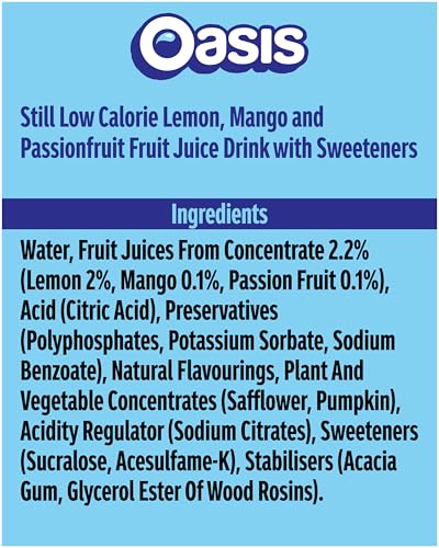 Water Fruit Juices from Concentrate 2.2% (Lemon 2%, Mango 0.1%, Passionfruit 0.1%) Acid (Citric Acid) Natural Flavourings Acidity Regulator (Sodium Citrates) Antioxidant (Ascorbic Acid) Preservatives (Sodium Benzoate, Potassium Sorbate) Sweeteners (Sucralose, Acesulfame K) Colour (Carotenes)