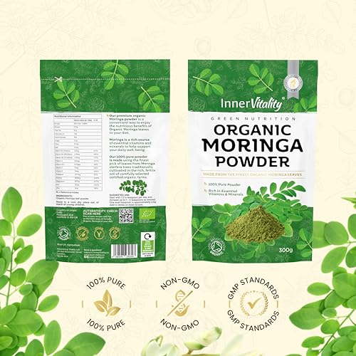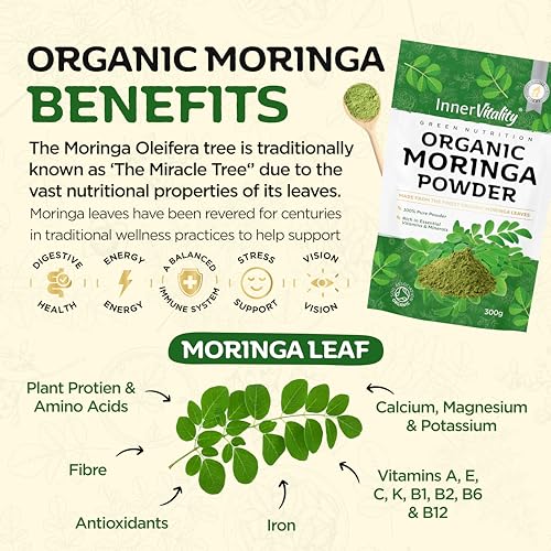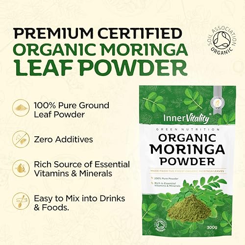 Specification: Organic Moringa Powder, UK Certified Premium Pure Leaf Powder Rich in Essential Vitamins & Minerals by Inner Vitality
