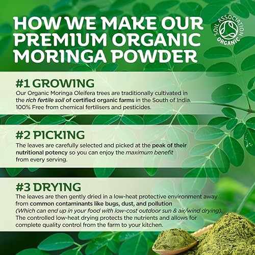 100% PURE & ORGANIC Our Moringa is traditionally grown in the nutrient rich soil of carefully selected certified organic farms free from chemical pesticides & fertilisers. The leaves are carefully selected & picked at the peak of their nutritional potency so you enjoy the maximum benefit from every serving.