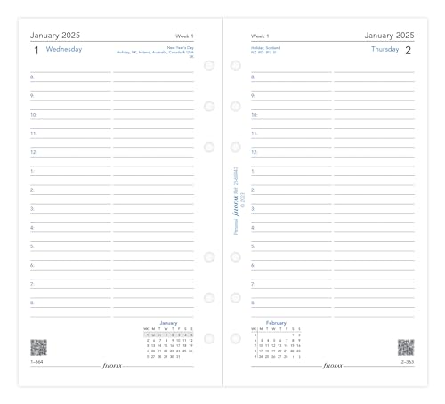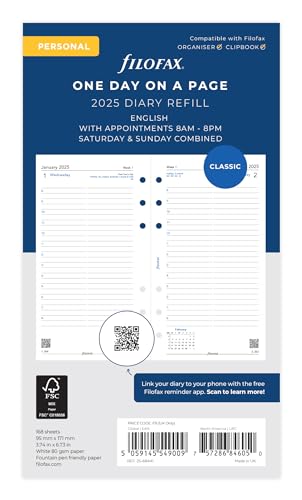 This Filofax Personal 2025 diary refill features a QR code on every day which, when used together with the Filofax Reminder App, allows you to plan on paper and review on your phone. Simply download the free Filofax Reminder app and scan the QR code on the date of your choice. This will allow you to not only copy appointments from your diary onto the App, but also set up reminders. The appointments can also be synced with your phone’s calendar. This innovation will allow you to always have the important contents of your diary with you. This Filofax personal day per page 2025 diary is printed in English and shows hourly appointment times from 8am to 8pm. Saturday and Sunday are combined on one page (no appointment times). The diary runs from January to December 2025. Paper size 95mm x 171mm, drilled with six round holes.