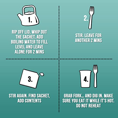 Quick, filling and tasty snack available in 10 more flavours Just add some water: Ready to eat in only 4 minutes None of that artificial colours or preservatives stuff