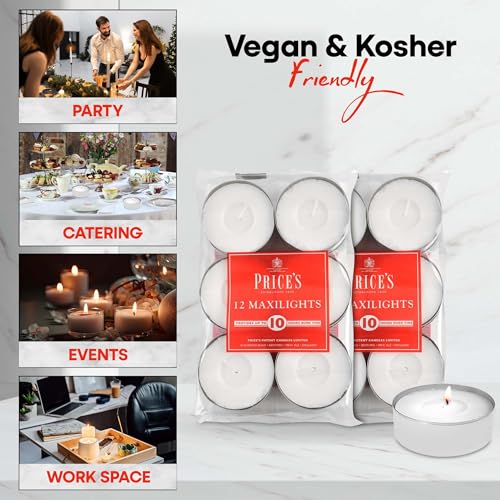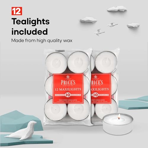 Specification: Price’s – Maxi Tealights – Pack of 12 – Unscented – 10 Hour Burn Time – Quality White Wax