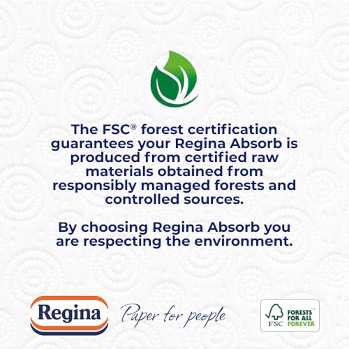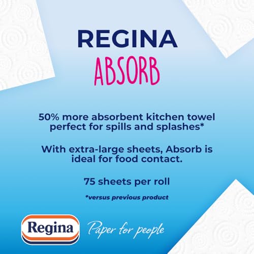 Regina Absorb kitchen towels are designed to make cleaning up as quick and easy as possible. These extra-large towels have two ultra-absorbent layers, allowing you to soak up spills, drips and accidents in seconds.New Regina Absorb kitchen towels are 50percent more absorbent than previous Regina Absorb towels. That means you can mop up even more mess with every single sheet. With each easy-to-open 8 pack of Regina Absorb, you are respecting the environment. Across 75 sheets per roll, Regina Absorb kitchen towels are created with 100percent natural cellulose, sourced from responsibly managed forests and controlled sources, guaranteed by the FSC forest certification. The quality and reliability of its materials make Regina Absorb a high-quality product that also protects and preserves the environment. Regina Absorb is a product made by Sofidel, an industry leader that promotes innovation to guarantee the wellness and hygiene of its customers and the environment.Regina Absorb: 50percent More Absorbent* for 100percent more kitchen creativity.