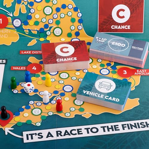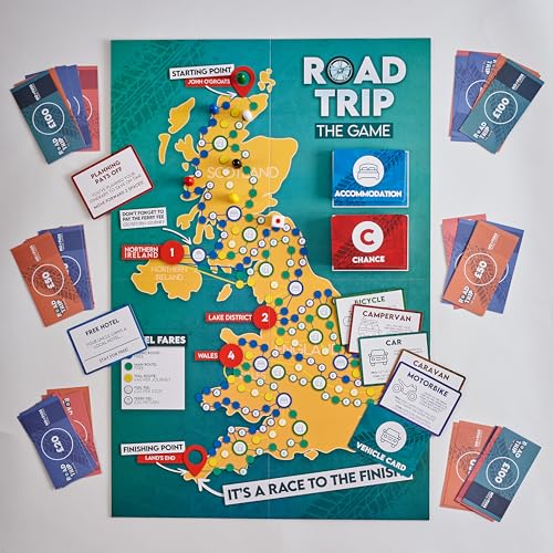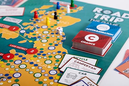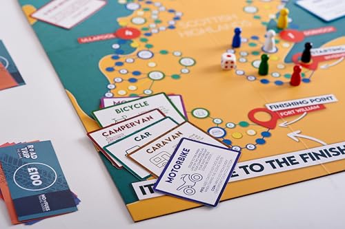 Road trip is an exciting board game of chance, tactics and pure chaos as you battle against your competitors to reach the finish. You’ll traverse the whole of the UK in any 1 of 6 modes of transport! You’ll encounter checkpoints, hilarious chance cards, fuel stops and accommodation. Take the speedy toll roads and risk blowing your budget or choose the slower scenic routes and preserve your funds, the choice is yours…