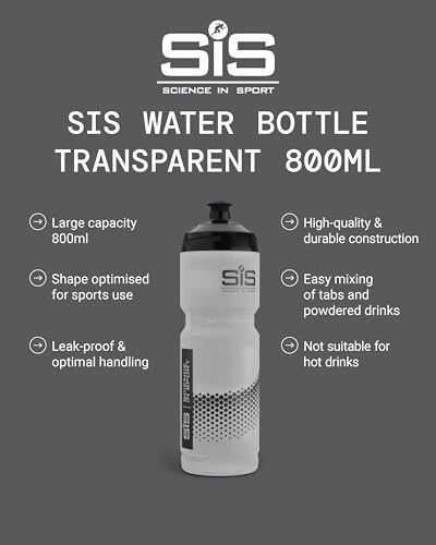 Science In Sport SIS Sports Bottle, Transparent Colour, 800 ml, is high-quality and ultra-durable for all types of sports and exercise. You can train harder, race faster and recover quicker with an SIS water bottle on hand. From the gym to home, or outdoors, this sports water bottle is ideal as a bike water bottle, cycling water bottle, or other water bottle gym needs. Made in the EU, this plastic water bottle is great to use with other SIS products and powders. Science in Sport has been a pioneer in sports nutrition since being founded in 1992. Throughout that period, SIS has worked closely with leading research institutes, sports scientists, performance directors and elite athletes to stay at the forefront of sports nutrition. Over the years many World Champions, Olympic medal winners and elite athletes have used SIS products to fuel their training and competition needs.