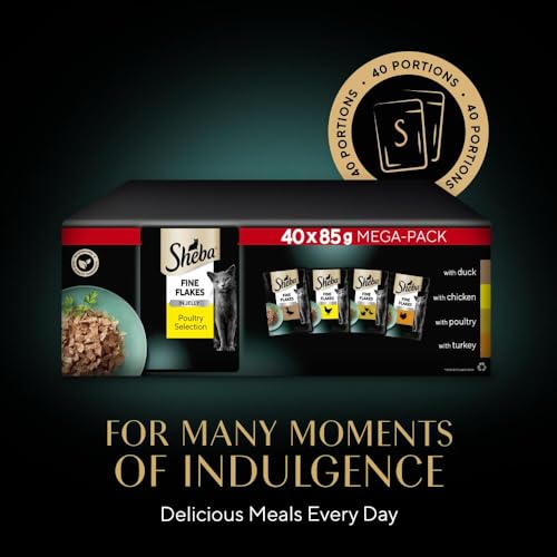 Items delivered: 40 x 85g bulk food SHEBA Fine Flakes Poultry Collection in Jelly / Multipack with poultry variety / Suitable for any adult cat