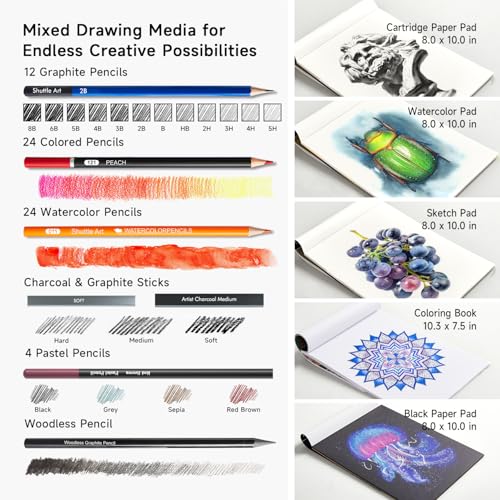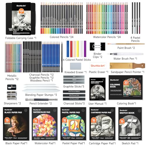 PROFESSIONAL DRAWING SET: Shuttle Art 124 pack art case includes 24 colouring pencils, 24 watercolour pencils, 12 metallic coloured pencils, 12 graphite pencils, 12 charcoal pencils, 4 pastel pencils, 1 woodless graphite pencil, 3 charcoal sticks, 3 graphite sticks, 6 coloured pastel sticks and complete drawing tools and drawing pads, perfect for creating art works with colouring, drawing, sketching and more.