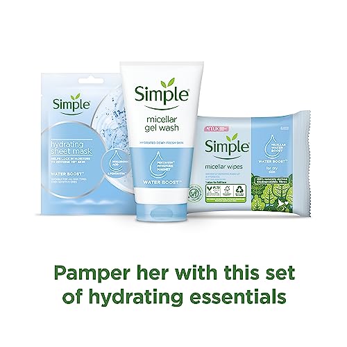 Give the gift of a hydrating skincare routine with the Simple Skin Kind Hydrating Beauty Bag Gift Set, which combines three full-size skin care products presented in a soft, machine-washable beauty bag. Enriched with hyaluronic acid and moisture magnet PENTAVITIN, our Simple Water Boost Hydrating Sheet Mask contains the perfect blend of ingredients to lock in moisture and reverse dry skin. Simple’s Water Boost Micellar Gel Wash contains PENTAVITIN plus micellar technology to provide gentle yet effective cleansing, leaving your skin feeling dewy fresh and hydrated. Made from 100% naturally derived biodegradeable fibres, Simple Water Boost Micellar Facial Wipes instantly remove make-up and hydrate your skin without drying it out. Just one wipe can be used for your full face. This kind-to-skin gift for her comes packed in a soft pastel-coloured beauty bag, perfect for storing all your beauty products, and machine washable at 30 degrees. Like all our products, these Simple gifts for her are infused with skin-loving ingredients and contain no artificial perfume or colour and no harsh chemicals that can upset the skin. Show just how much you care by giving her everything she needs to take care of her dry skin in the kindest way possible.