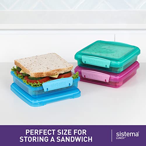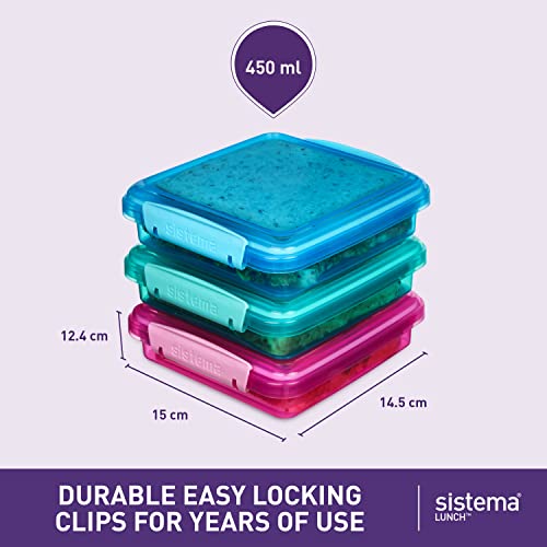Sistema Lunch Sandwich Boxes | 450 ml | Airtight School Lunch Boxes | Assorted Colours | 3 Count