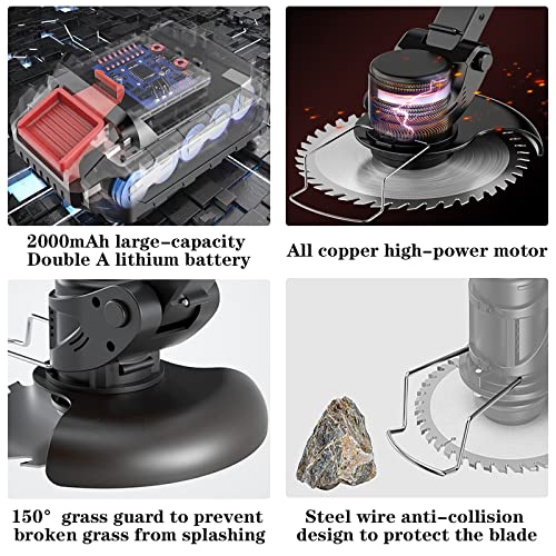 【90° Cutting Head & Safety】The grass strimmer has 90° cutting head which is easy to deal with different angles of use. Anti-collision iron bars doesn’t fear about damage when it touches hard stones or wall. Garden strimmer cordless has 150° protection cover that can effectively prevent grass splashing. To start the machine, you must first press the anti-mistouch switch and then press the start switch which can ensuring safety for accidentally use .