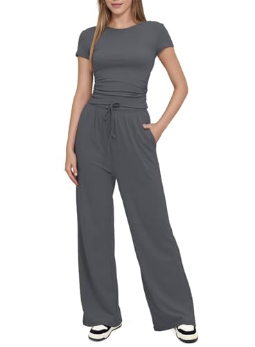 Specification: SotRong Summer 2 Piece Outfits Women Lounge Wear Sets Ruched Short Sleeve Crop Tops and High Elastic Waisted Wide Straight Leg Pants Tracksuit Activewear Casual Leisure Wear Sets