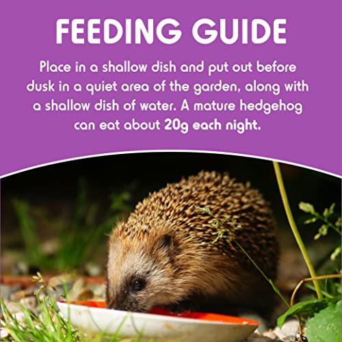 FEEDING GUIDE – Place in a shallow dish and put out before dusk in a quiet area of the garden, along with a shallow dish of water. A mature hedgehog can eat about 20g each night.