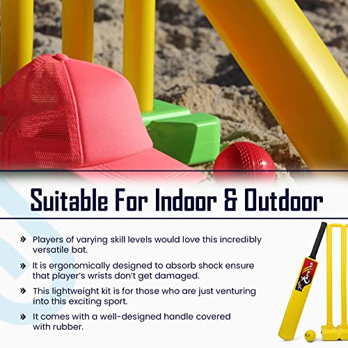 Splay Plastic Cricket Kwik Set for Children and Adults with Carry Bag – Quick Beach Set Suitable for Indoor Outdoor use Yellow Kit. Set includes Plastic Cricket Bat, Stumps Bails Windball, Stump Base and Carry Bag