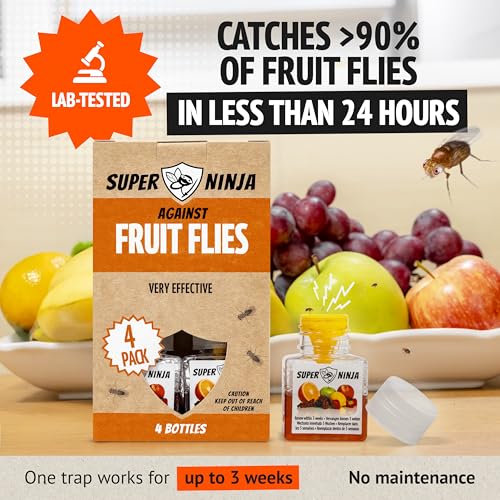 Super Ninja Fruit Fly Trap – 4 pack, Highly Effective Fruit Fly Killer for Home & Kitchen, Up to 3 Weeks of Performance per Bottle, Child & Pet Friendly