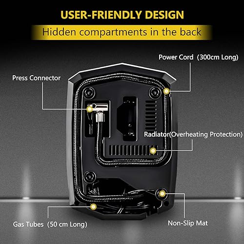 【LED-LIGHTING AND COMPACT DESIGN】 The tyre inflator comes with the LED lights and accurate pressure gauge to help you be ready for nighttime emergencies. Coupled with the 11.5 ft power cord, both of the front and the rear tires will be fully taken care of. Our car pumps for tyres is also compact and lightweight. GET 100% SATISFACTION AND 1 FULL YEAR WARRANTY!
