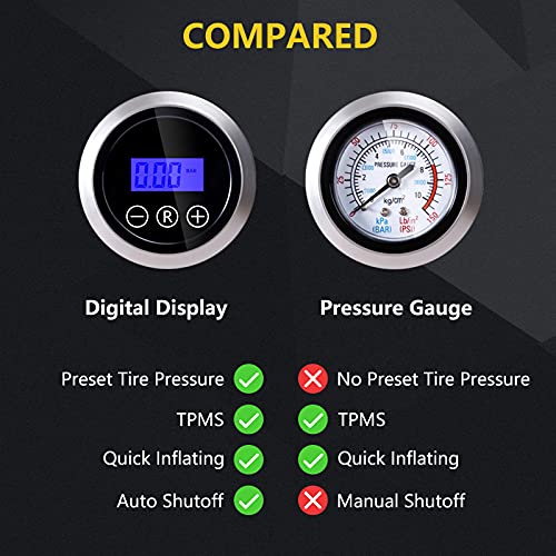 【DIGITAL DISPLAY】 Our digital car tyre inflator has a highly accurate and bright display, which is essential not only during the day but also at night. You can also select a desired unit of pressure measurement: PSI, BAR, KPA or KG/CM².