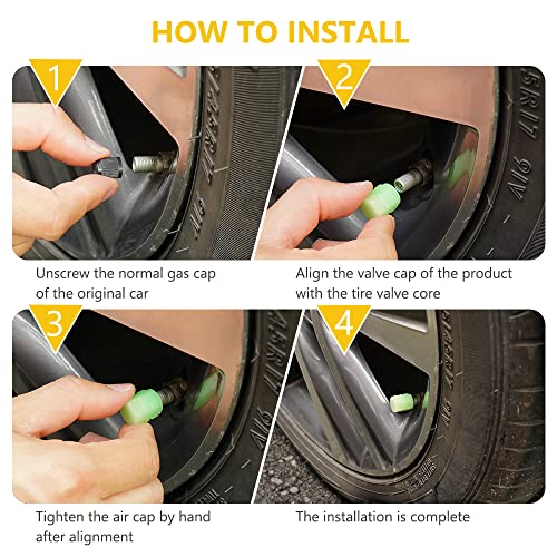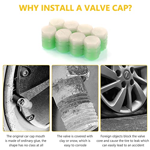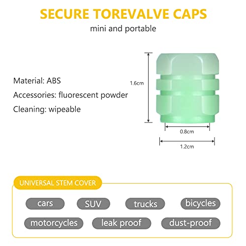 Specification: URAQT Tyre Valve Caps, 8 PCS Noctilucous Tire Air Caps Cover, Illuminated Auto Wheel Valve Stem Cap, Universal Car Accessories with O Rubber Ring for Car, Truck, SUV, Motorcycles, Bike