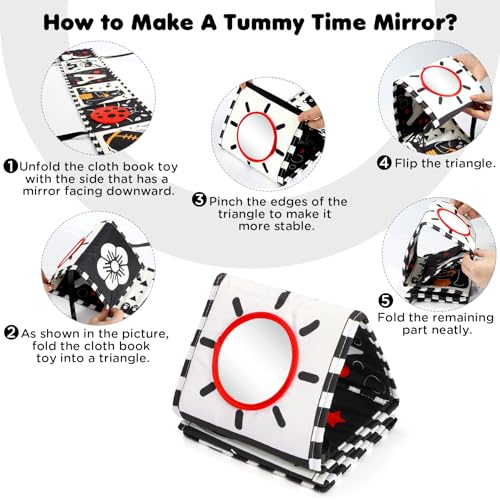 Ideal Toy for Tummy Time: You can also put these baby books on the floor for the tummy time. The high contrast patterns and the baby mirror can attract the baby’s attention for a long time, which could improve their fine motor skills, prevent flat head and help strengthen baby’s leg and arm muscles. Babies will enjoying touching and flipping thses sensory books, making tummy time fun.