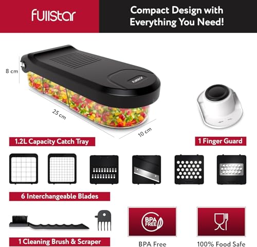 Great Value & Quality – The Fullstar vegetable chopper is an affordable mandoline slicer and cheese grater that doesn’t compromise on quality. It includes 6 stainless steel blades, 1 cleaning brush, 1 finger guard, and a 1.2L container for safe and efficient meal prepping.
