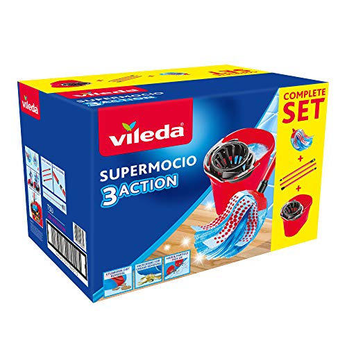 Specification: Vileda SuperMocio 3Action Mop and Bucket Set, Mop for Cleaning Floors, Set of 1x Mop and 1x Bucket, Red/Grey/Blue