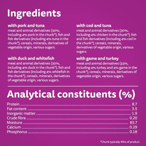 Whiskas 1+ Mixed Medeley adult cat food pouches in jelly combine two of your cats favourite flavours in one glorious meal, without compromising on nutrition Each wet cat food pouch is crafted with two irresistible flavours for a divine taste sensation that even the fussiest of cats cannot resist! Purrs guaranteed