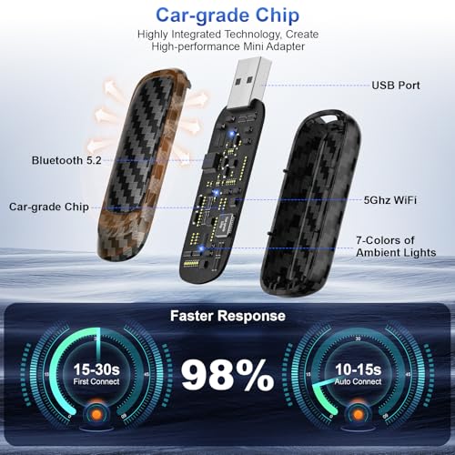 Plug and Play & Easy Setup: Using 5.8Ghz WiFi and Bluetooth 5.2 modules, the wireless adapter connects to your phone fast and provide great reliability, providing a solid and uninterrupted connection every time. Easy initial setup that only 3 steps to get wireless connection: 1 plug the wireless adapterinto your car USB port; 2 Correctly set Bluetooth and WiFi Connectivity; 3 Paired successfully and wireless adapter is ready.