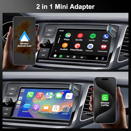 Compatible with CarPlay & Android auto: This 2 in 1wireless adapter integrates wireless CarPlay and Android Auto chips, making it support both wireless CarPlay and Android Auto. It converts your car’s original wired CarPlay into a wireless device for cordless convenience. In addition, equipped with USB-A and USB-C port extension cables, suitable for more car ports.