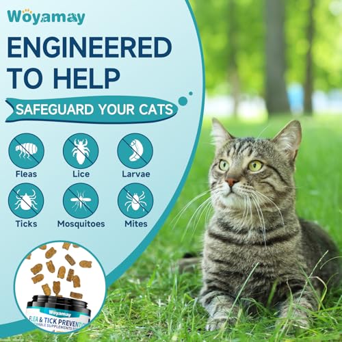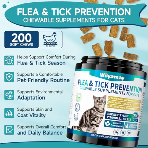 Woyamay Flea and Tick Support for Cats Chewables, 200 Treats Natural Cat Flea Chews, Daily Cat Flea Care, Flea Support Chewable Supplement for Cats Kittens for All Breeds, Chicken Flavor