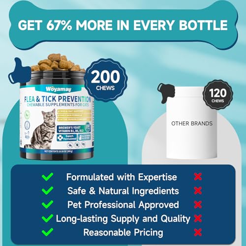 Specification: Woyamay Flea and Tick Support for Cats Chewables, 200 Treats Natural Cat Flea Chews, Daily Cat Flea Care, Flea Support Chewable Supplement for Cats Kittens for All Breeds, Chicken Flavor