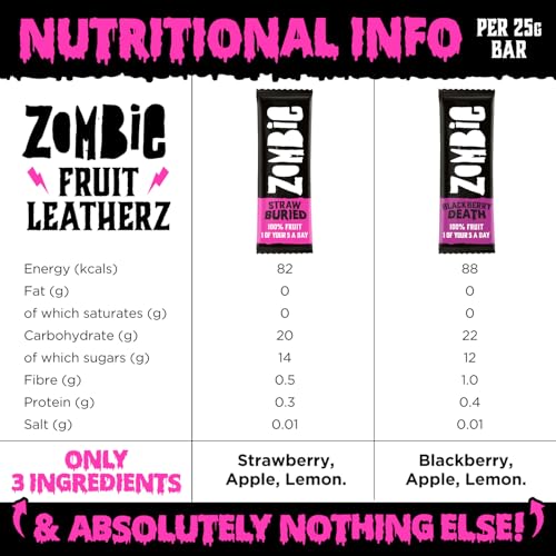 Specification: Zombie Fruit Bars, Strawberry & Blackberry (10 Bars, 2 Flavours), 100% Dried Fruit, Healthy Snacks, Adults, Kids, Halloween Trick or Treat, Low Calorie, Gluten Free, Vegan, Halal, Bulk, No Added Sugar